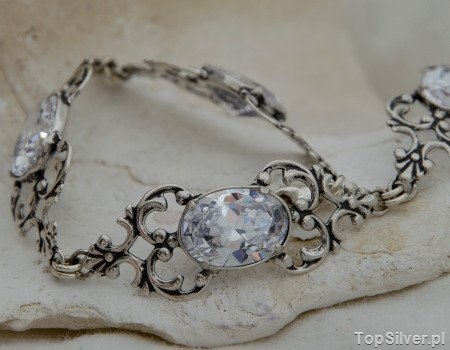Stylowa bransoleta, która swój piękny wzór zawdzięcza rozkwitowi jubilerstwa w carskiej Rosji. W niepowtarzalny ornament wkomponowany jest ogromny kryształ Swarovskiego.