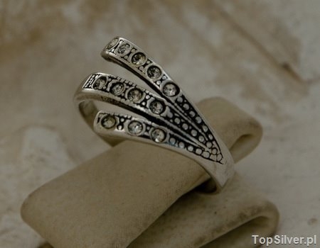 Bardzo gustowny srebrny pierścionek, którego motyw zdobniczy nawiązuje do zdobień z okresu art deco. W ciekawy motyw zdobniczy wkomponowanych zostało trzynaście połyskujących białych cyrkonii.