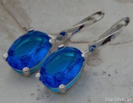 Urokliwe, srebrne kolczyki, w których najważniejszą i najbardziej przykłuwającą uwagę częścią jest okazały akwamaryn (synt.).