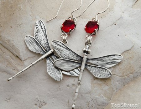 Srebrne kolczyki ważki – symbol secesji a także hit popularności. Ważka połączona została z pięknym rubinem (synt) zakutym w srebrną oprawę.