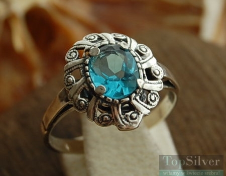 Delikatny, srebrny pierścionek, w którego oksydowaną oprawkę zakuty został akwamaryn(synt)