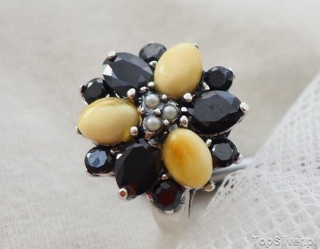 AMATA – srebrny pierścień onyksy, perły i bursztyny