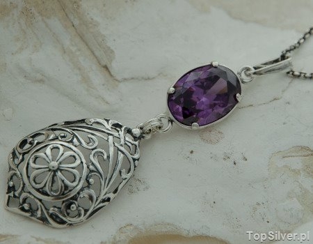 Stylowy srebrny wisior, którego dekor nawiązujący do tradycji Hiszpani spod panowania Maurów,  został wykończony pięknie wybarwionym ametsytem.