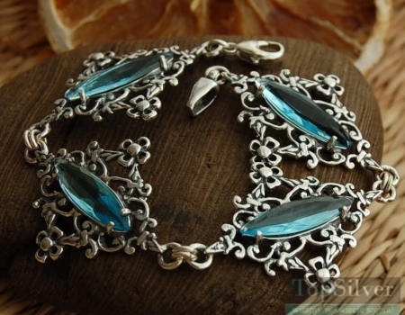 Stylowa i niepowtarzalna srebrna bransoleta, której wzornictwo czerpało inspirację z jubilerstaw carskiej Rosji. W każdym ogniwie bransolety zakuto pięknie wybarwione syntetyczne akwamaryny.