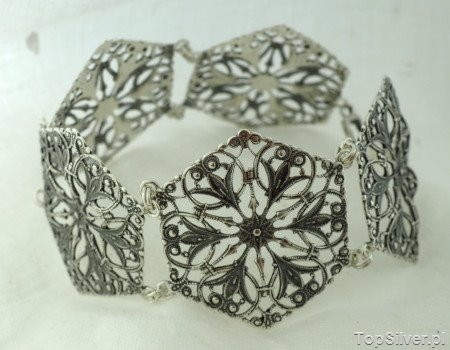 Przedstawiamy srebrną, szeroką, ażurową bransoletę, której misterne filigrany swoimi kształtami nawiązują do motywów roślinnych. Rozeta każdego ogniwa, posiada w centralnym miejscu kwiat, z którego wyrastają w sześciu kierunkach łodygi, z których wyrastają piękne lilie. Symetryczne rozłożenie zdobień, wkomponowane jest w sześciokątny kształt biżuterii. Należy tu dodać, że nawiązanie do okresu secesji nie odwołuje sie bezpośrednio do wiedeńskiego art nouveau, raczej skłonni jesteśmy wskazać jako źródło secesję kastylijską.