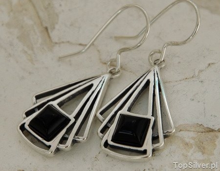 Niespotykane srebrne kolczyki. Stylistyka tego wyrobu to esencja uwielbienia symetrii kształtów. Całość doskonale uzupełniają onyksy.