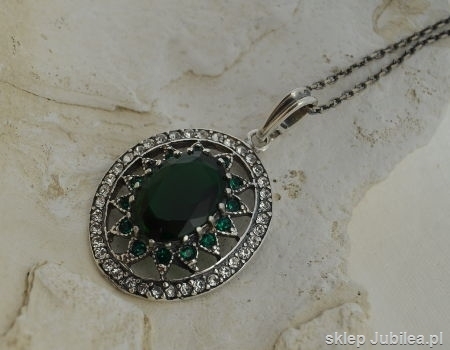 Eksluzywny, srebrny wisior ze szmaragdem oraz kryształkami Swarowskiego. W centralnym miejscu umieszczono szmaragd (synt) o wymiarze owalu 14x10mm, wokół niego umieczono 14mniejszych szmaragdów na obrzeżach ogniwa umieszczono wianuszek z 40 kryształków Swarovskiego.