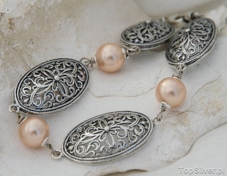 Piękna srebrna bransoleta, w której pomiędzy oksydowane ogniwa, inspirowane motywami roślinnymi wkomponowane zostały naturalne perły (majorka).