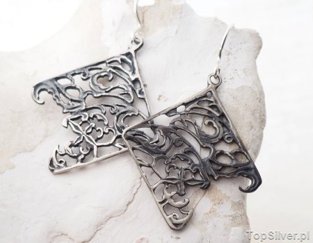 Oryginalne srebrne kolczyki, w których nieregularnym kształcie zamknięty został piękny ażurowy motyw zdobniczy.