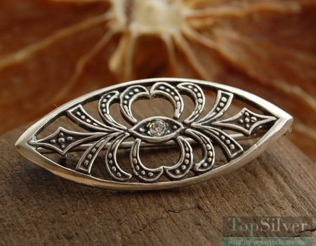 Srebrna broszka, której wzornictwo nawiązuje do starożytnych motywów wzorniczych.