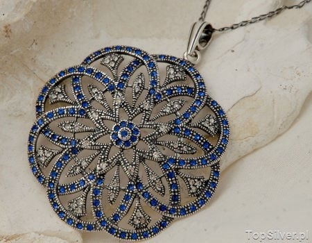 Przedstawiamy najwiekszy srebrny wisior dostępny w naszym sklepie. Jest to nasz autorski wyrób i nie znajdziecie go w żadnym innym sklepie. W wisiorze, przypominającym kwiat – charakteryzującym się doskonałą symetrią wkomponowane zostało aż 129szafirów z pracowni Swarovskiego oraz 48 drobnych kryształków!!