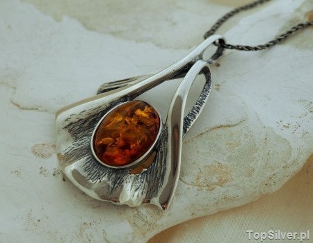 Srebrny wisior o bardzo interesujacym i eleganckim wzornictwie. W centrum, którego wkomponowany został naturalny bursztyn w kolorze koniaku o wymiarach 10x13mm.
