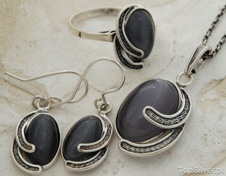 Piękny srebrny zestaw biżuterii (kolczyki, wisior oraz pierścień), inspirowany osiągnięciami imperium biznatyjskiego. W misterne zdobienia wkomponowano kocie oczka.