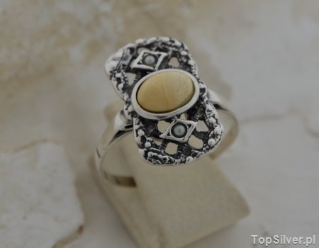 W centralnym miejscu znajduje się naturalny mleczny bursztyn, a po jego bokach maleńkie perełki.