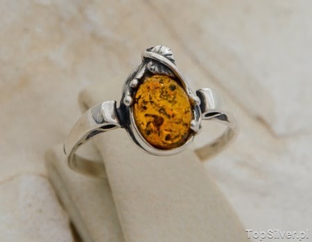 Delikatny, srebrny pierścionek, w którego roślinny motyw zdobniczy wkomponowano piękny naturalny bursztyn.