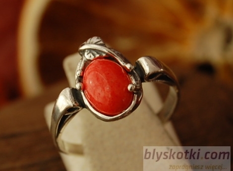 Delikatny srebrny, pierścionek zainspirowany, secesyjnymi motywami roślinnymi. Koral, zamkniety jest w srebrnej ramce, ozdobionej maleńkimi listkami.