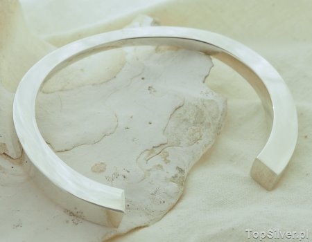 Masywna srebrna bransoleta, dla ludzi którzy lubią czuć wagę biżuterii. Ta ważąca niemal 64 gramy, srebrna bransoleta (pełna w środku), na pewno przyciągać będzie uwagę. Bransoleta zaczyna się od pręta o profilu kwadratu o wymiarach 8x8mm i płynnie maleje by dokładnie na środku mieć wymiar 4x4mm po czym ponownie rośnie do wymiaru 8x8mm. Jest to sztywna bransoleta, a odstęp pomiędzy jej krańcami pozwala na jej założenie raczej każdej osobie. Jej długość to 16cm a odstęp pomiędzy krawędziami to 4cm. Jeśli podoba się Tobie taka biżuteria ale potrzebna jest jakaś modyfikacja to śmiało skontaktuj się w nami w tej sprawie. Nasz złotnik wykona taką specjalnie dla Ciebie.