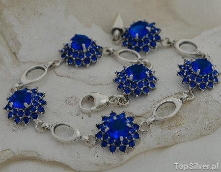 Modny kształt, w którym udało się wyeksponować pięknie połyskujący szafir (synt), kompozycje uzupełniając drobnymi szafirami umieszczonymi wokół kamienia w koronie. Drobnych kamieni jest aż 24sztuki (w kazdym kwiatku). To z całą pewnością bransoletka dla kobiety pragnącej czuć się wyjątkowo.