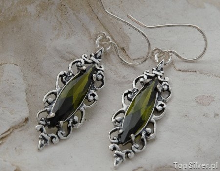 Delikatne srebrne kolczyki, w których ażurowe oksydowane oprawy zostały zakute piękne oliwiny.