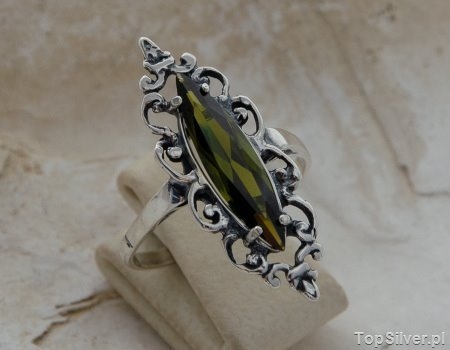 Srebrny pierścień w którego centralnym punkcie zakuty został pięknie wybarwiony oliwin.