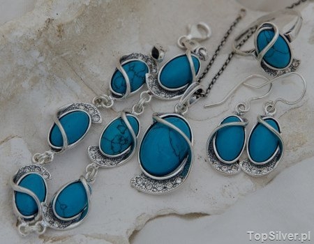 Przedstawiamy interesujący w kształcie zestaw srebrnej biżuterii w składzie kolczyki, wisiorek, pierścionek oraz bransoletka. W każdy element zdobniczy zestawu (oprócz wisiorka) wkomponowano turkus o wymiarach (9x13mm) a całość podkreślono trzema kryształkami Swarovskiego. W wisiorku zaś umieszczono turkus o wymiarach 12x18mm a całość podkreślono pięcioma kryształkami Swarovskiego.
