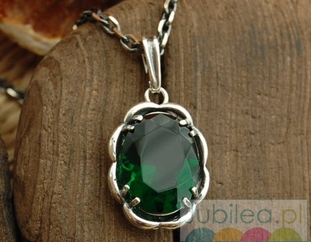 Bardzo elegancki, srebrny wisiorek, w którego delikatną srebrną oprawę zakuto okazały fasetkowany szmaragd(synt).