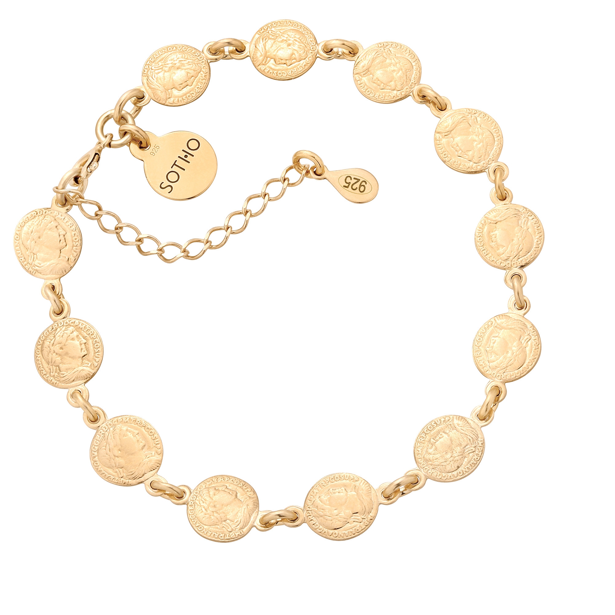 Złota bransoletka zdobiona monetkami i zawieszką z logo marki. Całość wykonana ze srebra 925 powlekanego 24 karatowym żółtym złotem.