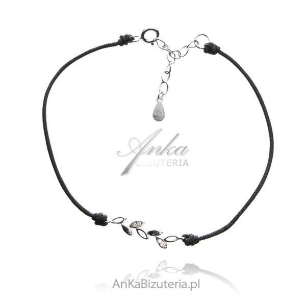 Srebrna bransoletka pr. 925 rodowana na czarnym woskowanym sznurku Waga bransoletki ~ 0,9 gWymiary bransoletki – długość 16 cm plus przedłużka 3 cmWielkość listek : 2 cm/0,5 cm