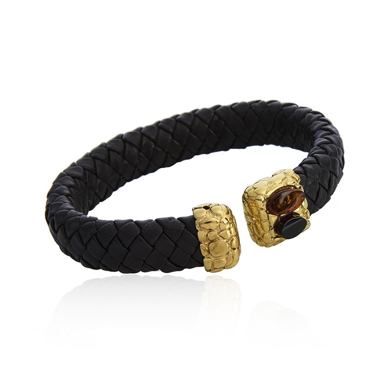 Bransoletka srebrna pozłacana z wiśniowo-koniakowym bursztynem na skórze