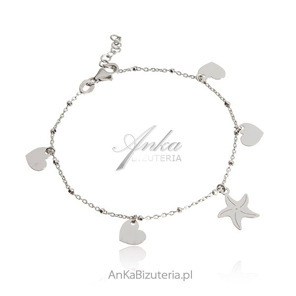 Bransoletka srebra, z delikatnymi zawieszkami w kształcie rozgwiazdy i serduszek posiada unikalny, mocno nowoczesny charakter. Jej niebanalny wygląd doskonale współgra z wieloma stylizacjami, dlatego pomysł jest noszony przez gwiazdy z pierwszych stron gazet. Wyjątkowe wykonanie klasycznego łańcuszka nadaje całości dziewczęcego uroku. Niewielka rozgwiazda, umiejscowiona w centralnej części w towarzystwie serduszek z pewnością przyniesie szczęście, a cała biżuteria stanie się nieprzeciętnym talizmanem. Propozycja dla kobiet lubiących skromną, ale wdzięczną ozdobę, pasującą przy wielu okazjach.
