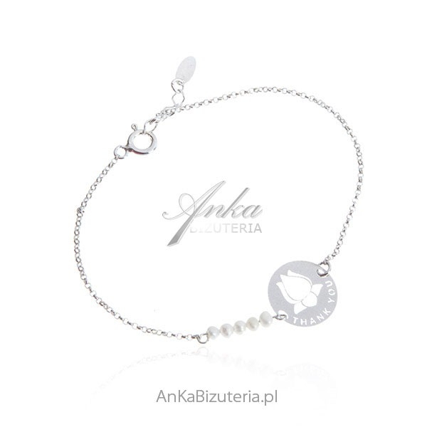 Prezentowana celebrytka łączy w sobie skromność i elegancję. Stabnowi bowiem dodatek uzupełniony białymi perełkami i zawiszką z napisem “THANK YOU”. Sprawdzi się jako biżuteria dla dzieci z grawerem, ale z pewnością sprawi przyjemność również dojrzałej kobiecie. Jest formą ponadczasową, o precyzyjnym wykonaniu i stylowej elegancji.