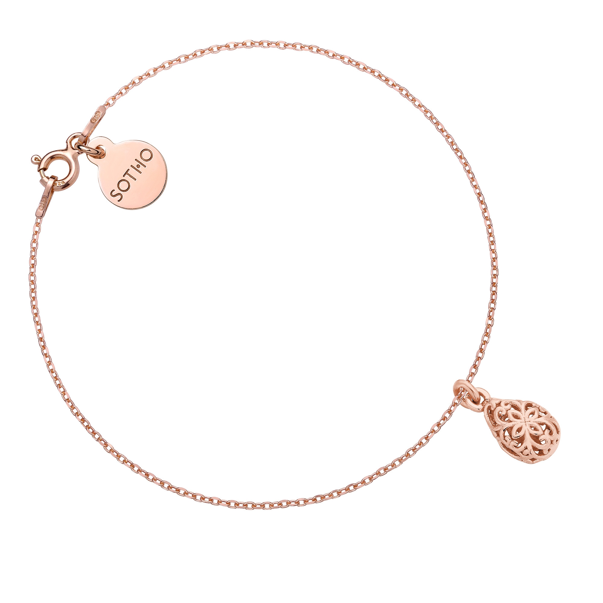 Złota bransoletka łańcuszkowa z ażurową łezką i z zawieszką z logo marki. Całość wykonana ze srebra 925 powlekanego 24 karatowym różowym złotem.