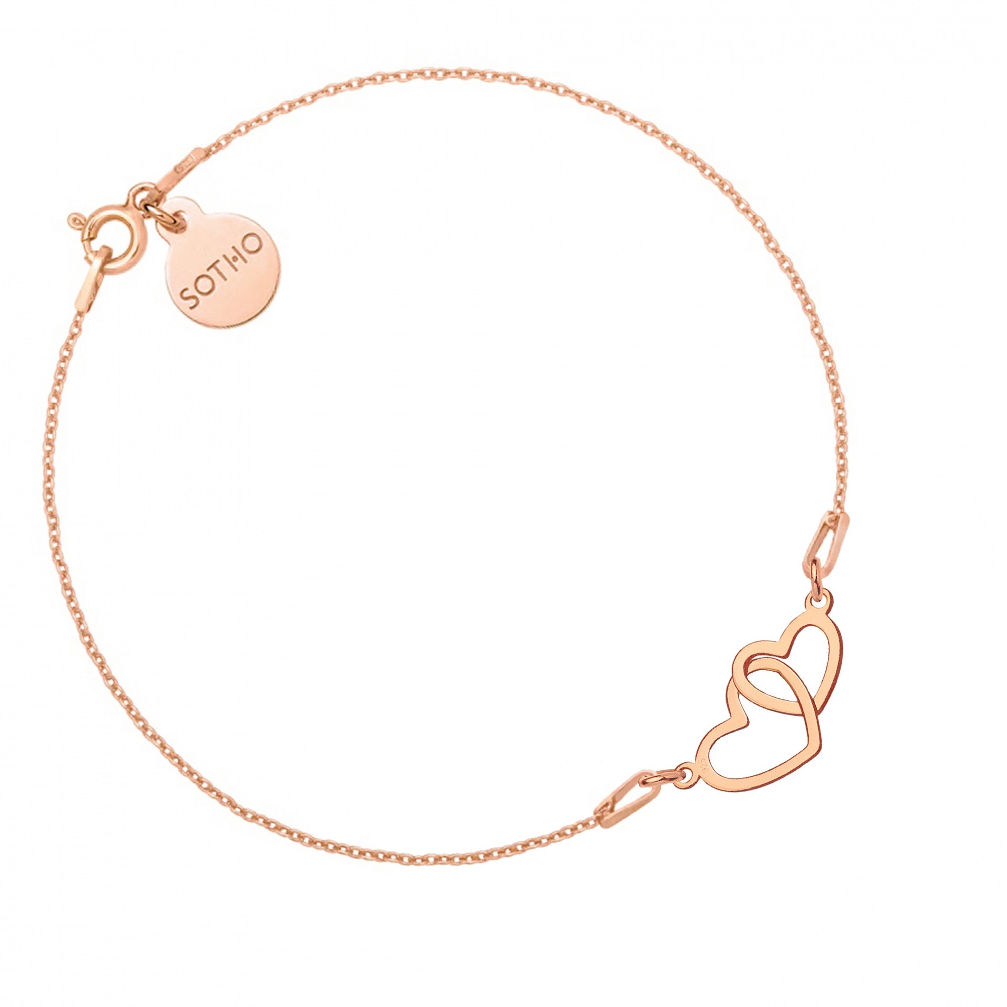 Złota bransoletka łańcuszkowa z dwoma serduszkami i zawieszką z logo marki. Całość wykonana ze srebra 925 powlekanego 24 karatowym różowym złotem.