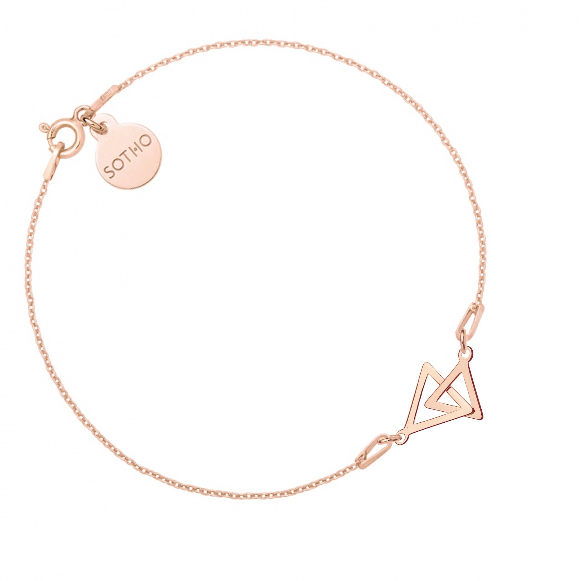 Złota bransoletka łańcuszkowa zdobiona dwoma trójkątami i zawieszką z logo marki. Całość wykonana ze srebra 925 powlekanego 24 karatowym różowym złotem.
