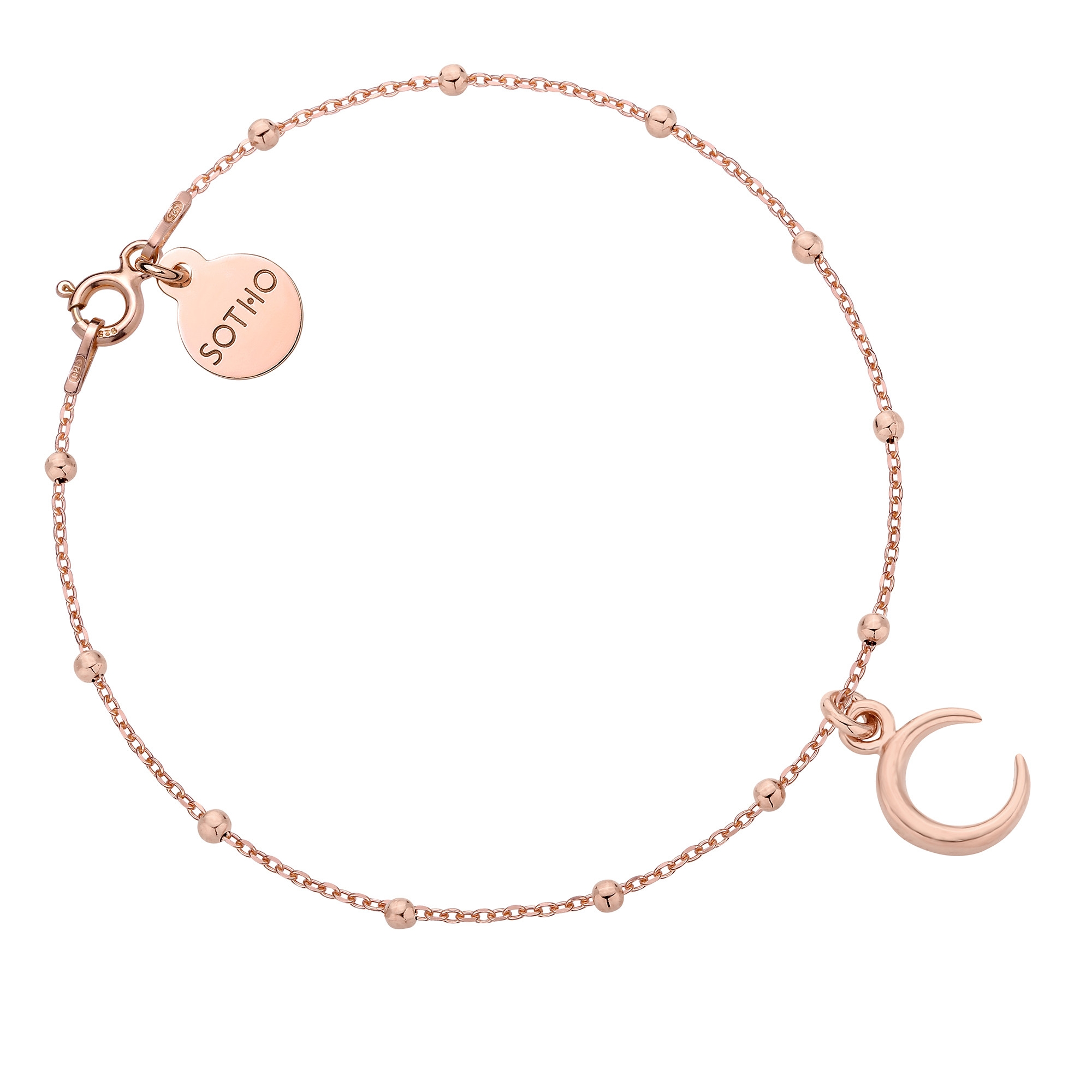 Złota bransoletka kuleczkowa zdobiona księżycem i zawieszką z logo marki. Całość wykonana ze srebra 925 powlekanego 24 karatowym różowym złotem.