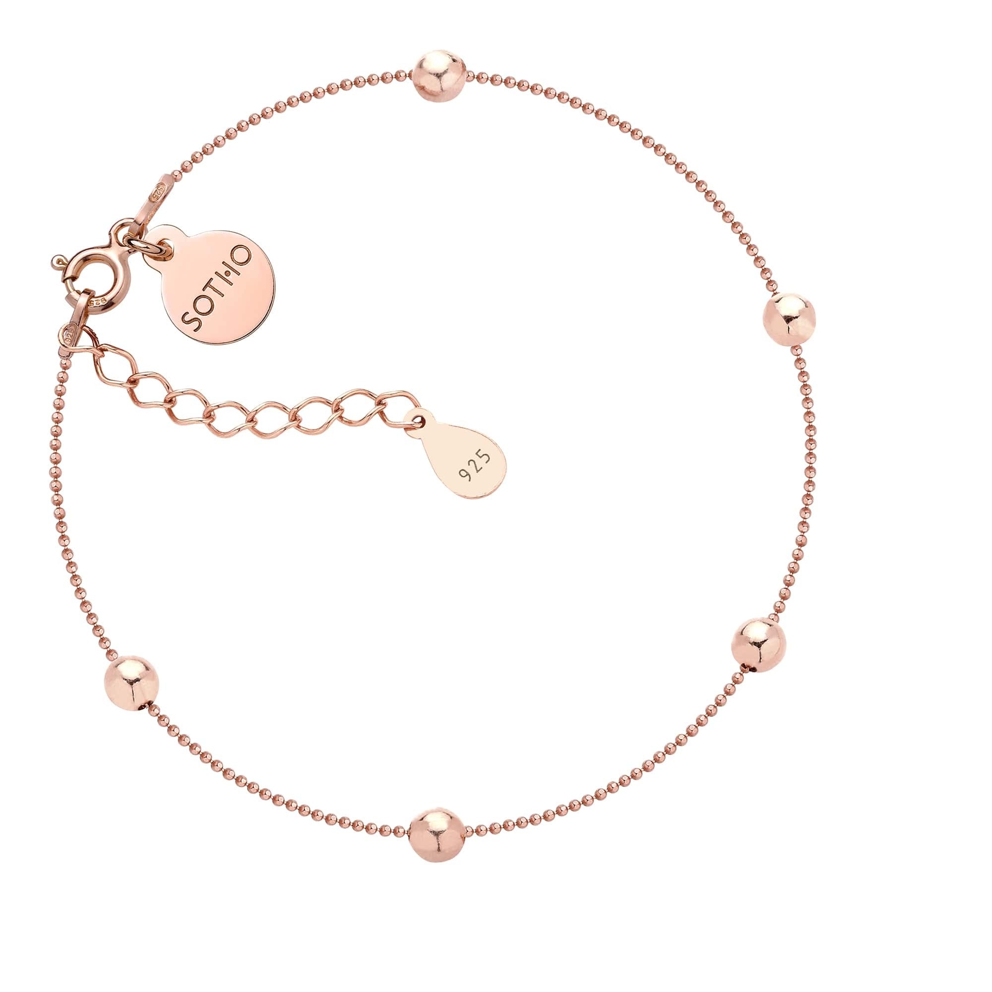 Złota bransoletka z kuleczkami, przedłużką  i zawieszką z logo marki. Całość wykonana ze srebra 925 powlekanego 24 karatowym różowym złotem.