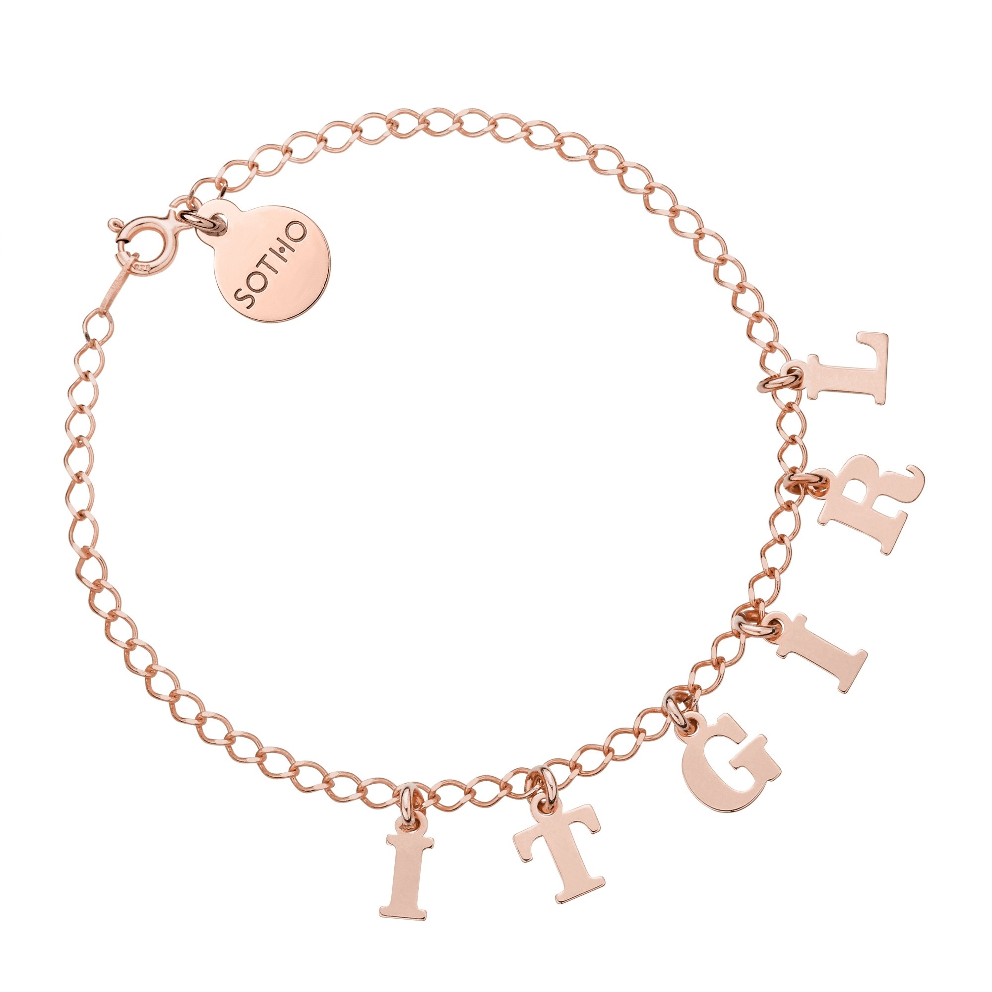 Złota bransoletka zdobiona zawieszkami (literki i cyferki) i  logo marki. Całość wykonana ze srebra 925 powlekanego 24 karatowym różowym złotem.