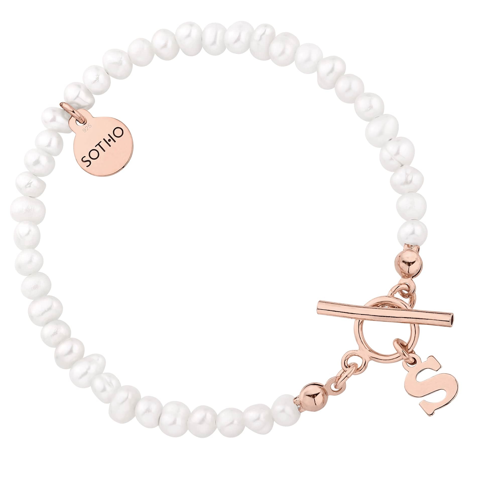 Bransoletka wykonana z naturalnych pereł słodkowodnych, zdobiony zapięciem i zawieszką (do wyboru literki i cyferki) oraz logo marki. Wszystkie elementy wykonane ze srebra 925 powlekanego 24 karatowym różowym złotem. Perły są nieregularne, unikatowe, delikatnie różnią się od siebie i mogą różnić się od tych na zdjęciu.