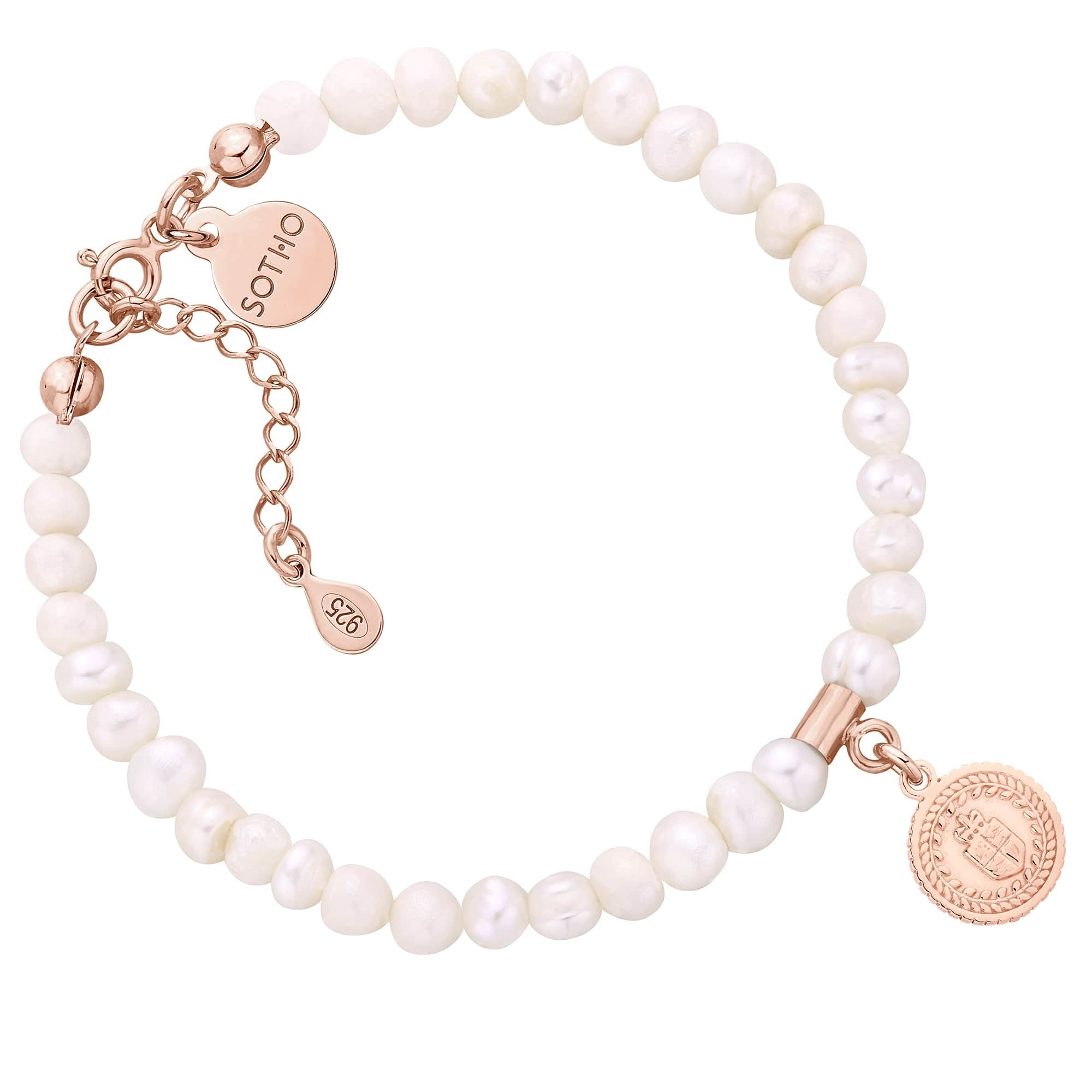 Bransoletka wykonana z naturalnych pereł słodkowodnych, zdobiona medalionem i zawieszką z logo marki. Wszystkie elementy wykonane ze srebra 925 pokrytego 24 karatowym różowym złotem.
