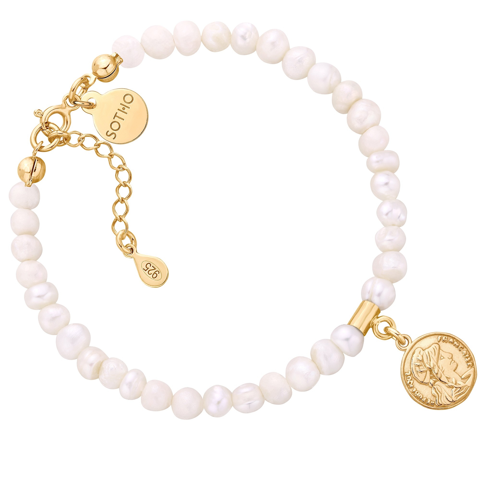 Bransoletka wykonana z naturalnych pereł słodkowodnych, zdobiona monetą i zawieszką z logo marki. Wszystkie elementy wykonane ze srebra 925 powlekanego 24 karatowym żółtym złotem. Perły są nieregularne, unikatowe, delikatnie różnią się od siebie i mogą różnić się od tych na zdjęciu.