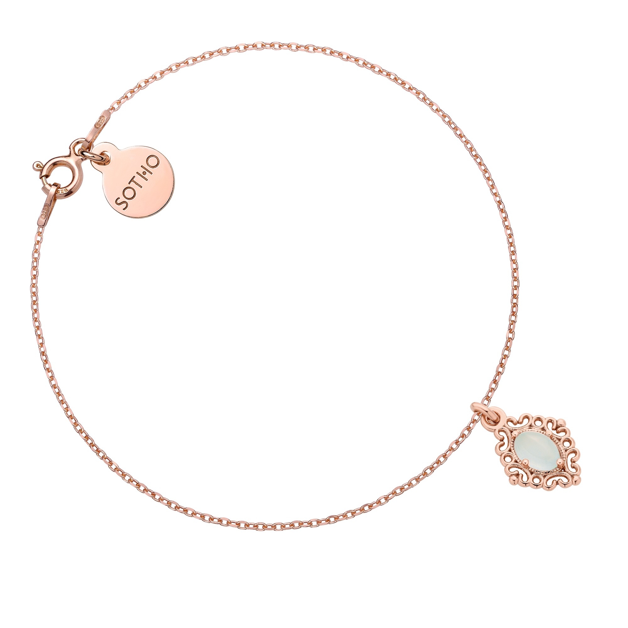Złota bransoletka zdobiona zawieszką z agatem Aqua i zawieszką z logo marki. Całość wykonana ze srebra 925 powlekanego 24 karatowym różowym złotem.
