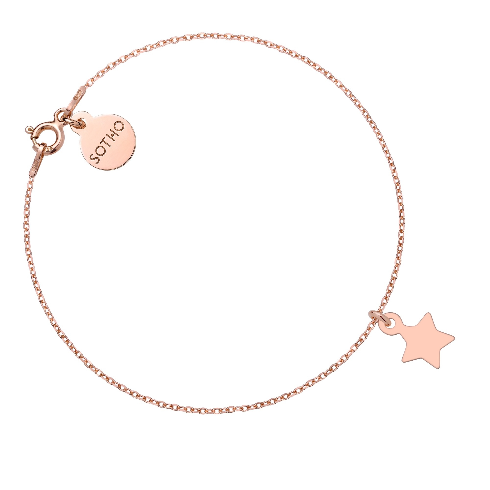 Złota bransoletka łańcuszkowa zdobiona gwiazdką i zawieszką z logo marki. Całość wykonana ze srebra 925 powlekanego 24 karatowym różowym złotem.