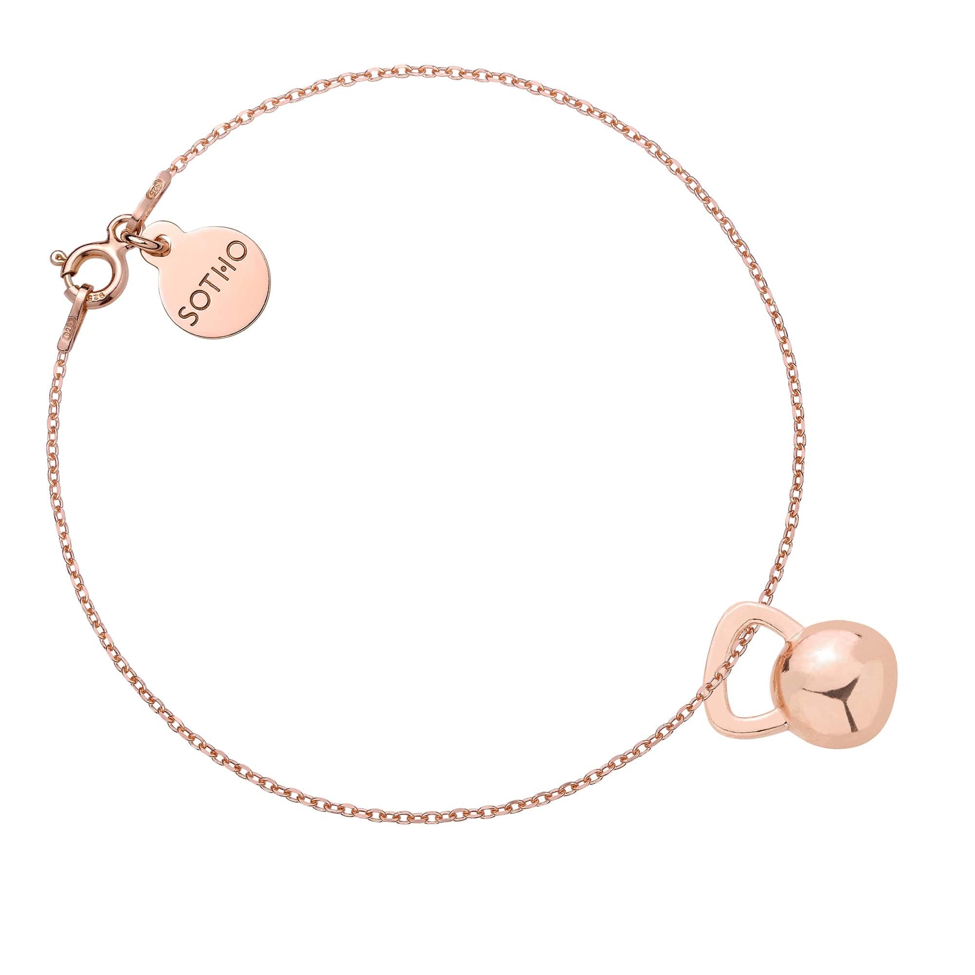 Złota bransoletka łańcuszkowa zdobiona kettlebellem i zawieszką z logo marki. Całość wykonana ze srebra 925 powlekanego 24 karatowym różowym złotem.