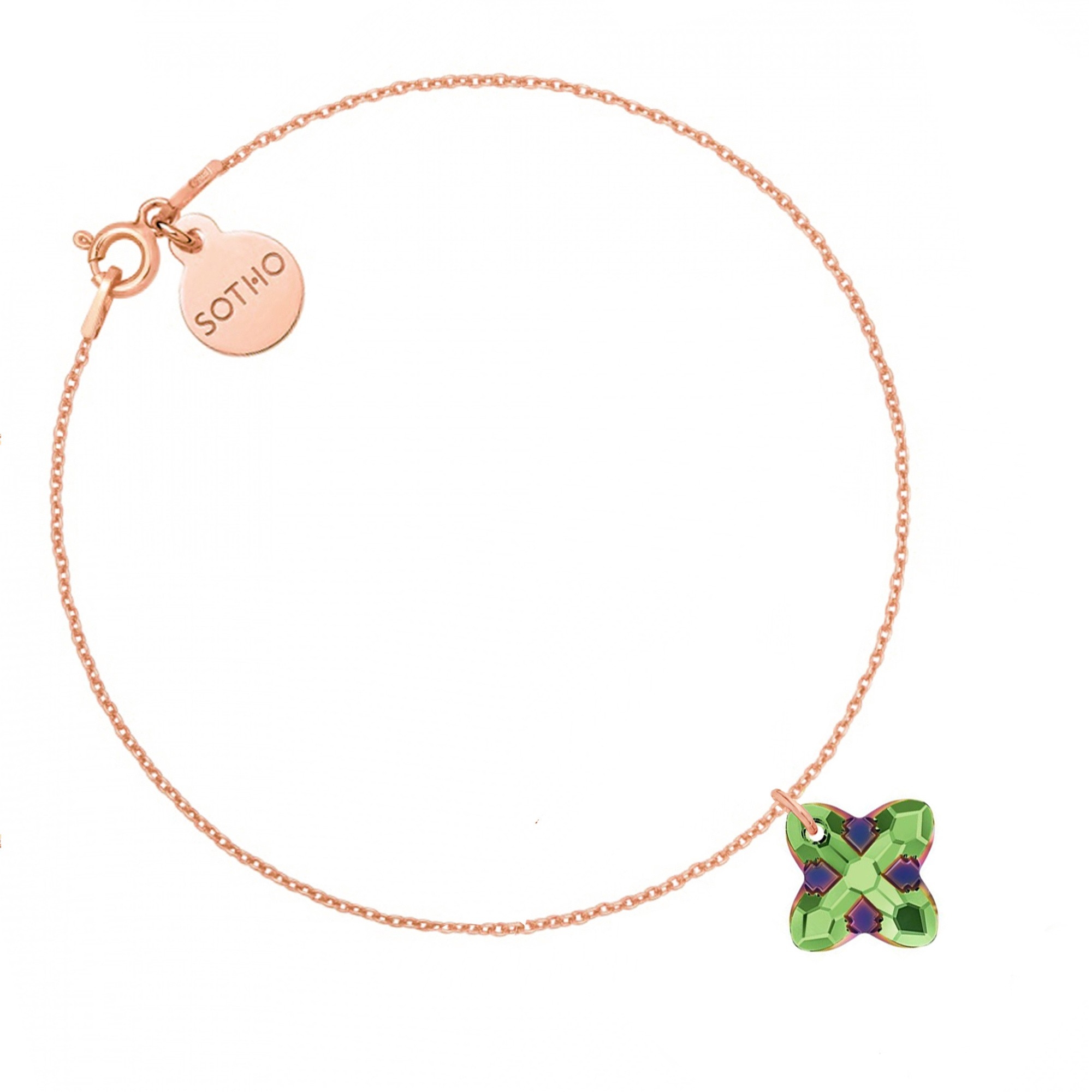 Złota bransoletka łańcuszkowa ozdobiona dwustronnym kryształem SWAROVSKI® CRYSTAL w dwóch kolorach Peridot i Scarabeus Green oraz zawieszką z logo marki. Wszystkie elementy wykonane są ze srebra 925 powlekanego 24 karatowym różowym złotem.