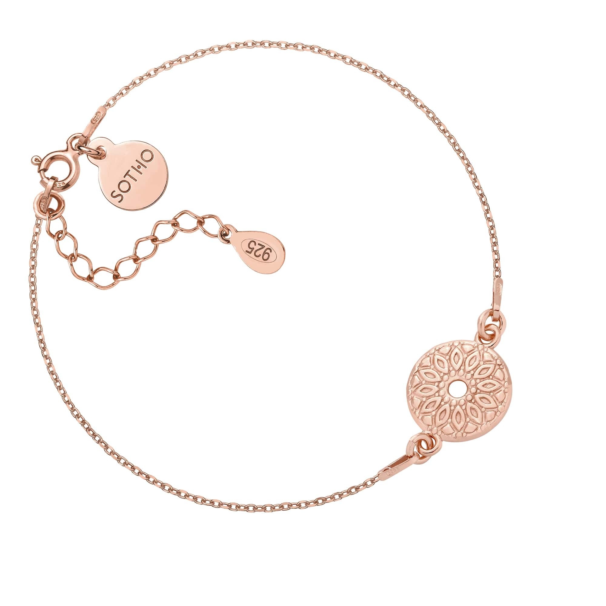 Złota bransoletka łańcuszkowa zdobiona medalionem i zawieszką z logo marki. Całość wykonana ze srebra 925 powlekanego 24 karatowym różowym złotem.