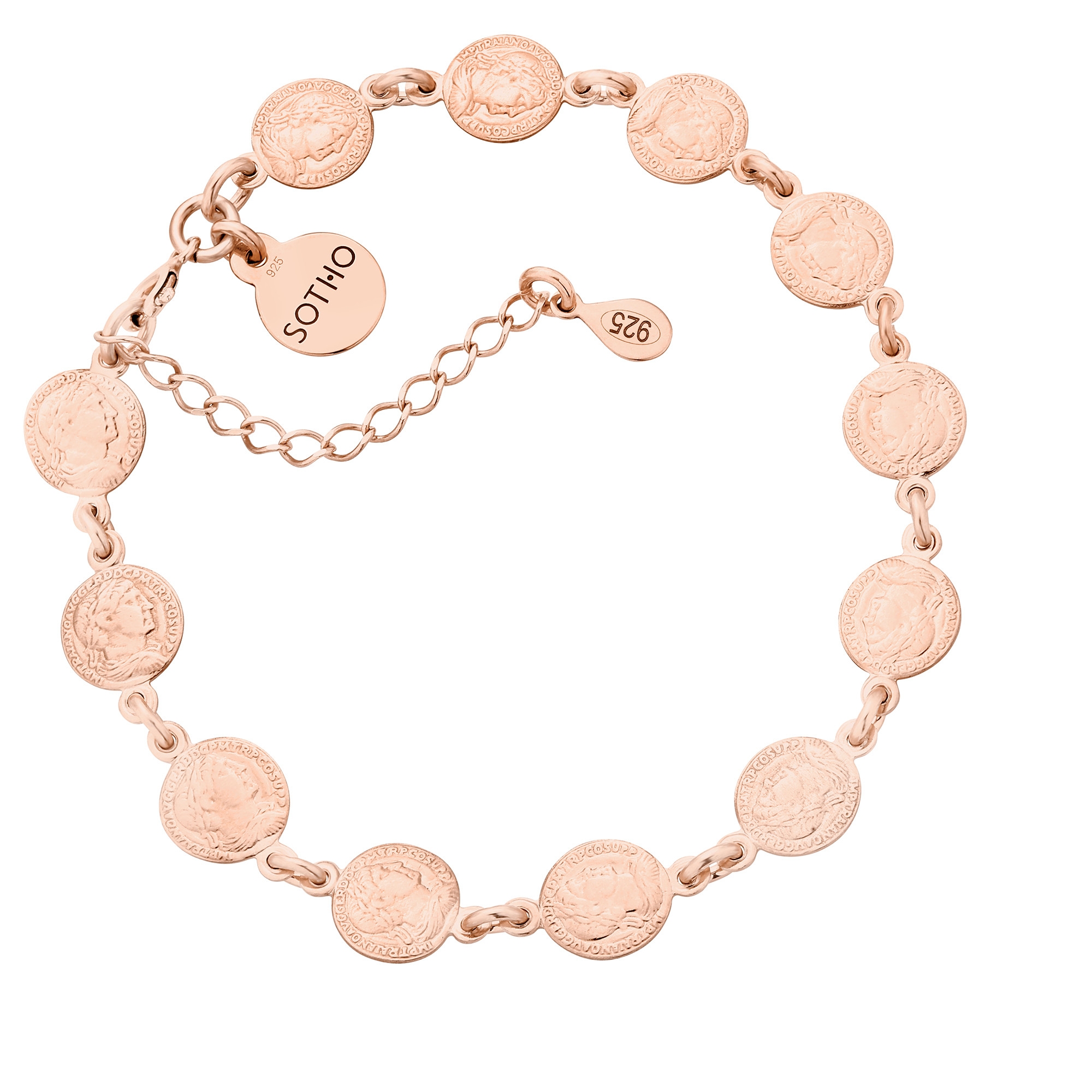 Złota bransoletka zdobiona monetkami i zawieszką z logo marki. Całość wykonana ze srebra 925 powlekanego 24 karatowym różowym złotem.