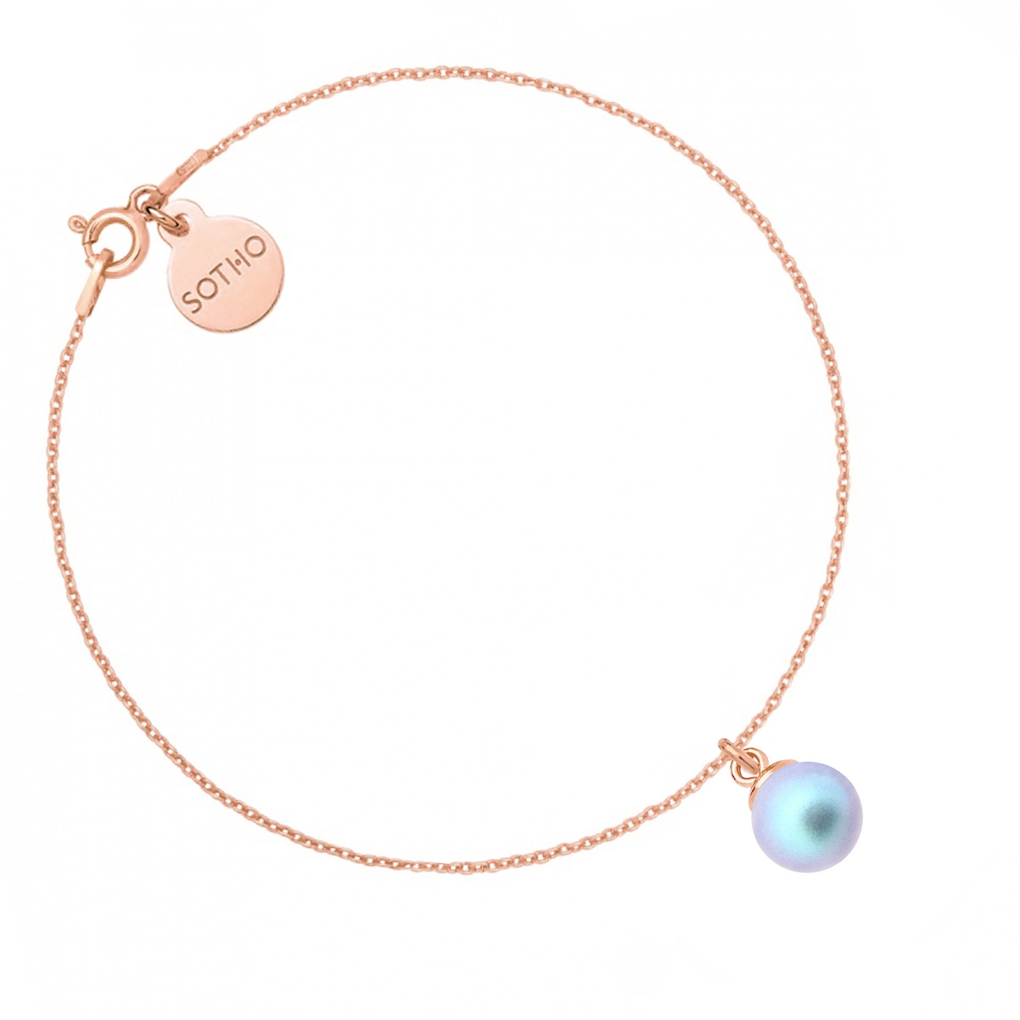 Złota bransoletka łańcuszkowa zdobiona perłą SWAROVSKI® CRYSTAL w kolorze niebieskim opalizującym Iridescent Light Blue i zawieszką z logo marki. Całość wykonana ze srebra 925 powlekanego 24 karatowym różowym złotem.