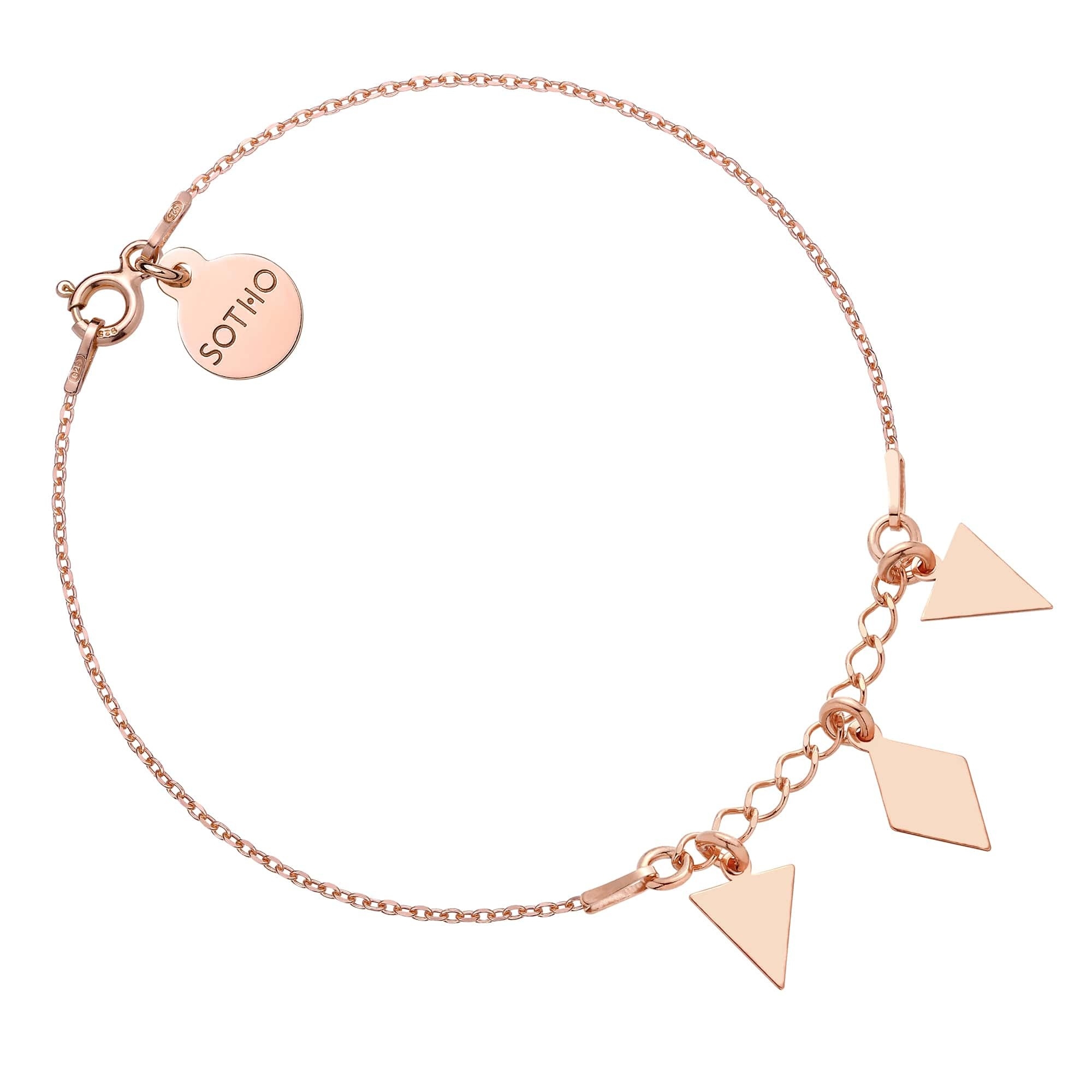 Złota bransoletka łańcuszkowa zdobiona trójkątami, rombem i zawieszką z logo marki. Całość wykonana ze srebra 925 powlekanego 24 karatowym różowym złotem.