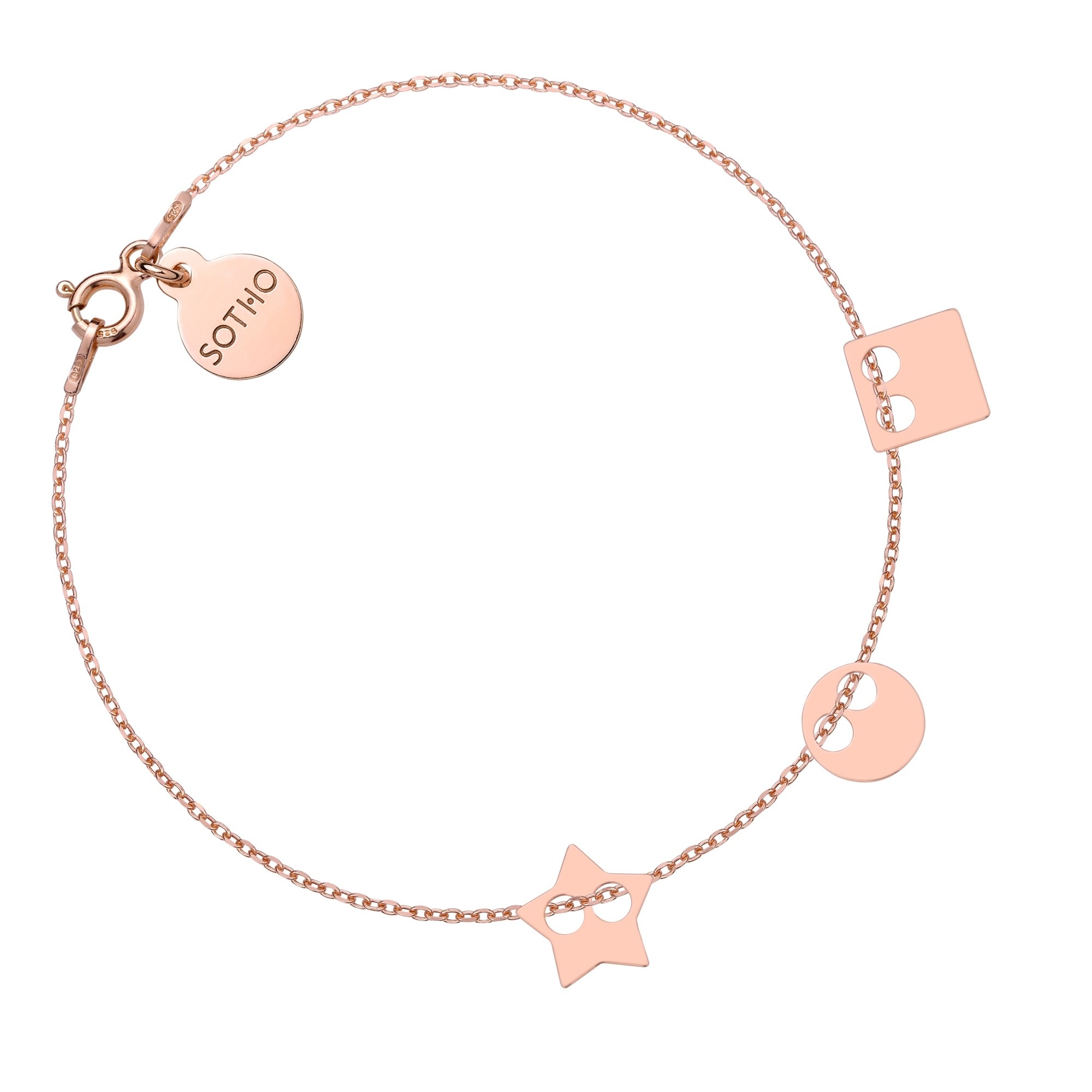 Złota bransoletka łańcuszkowa zdobiona trzema zawieszkami(gwiazdka,kwadrat,karma) i zawieszką z logo marki. Całość wykonana ze srebra 925 powlekanego 24 karatowym różowym złotem.
