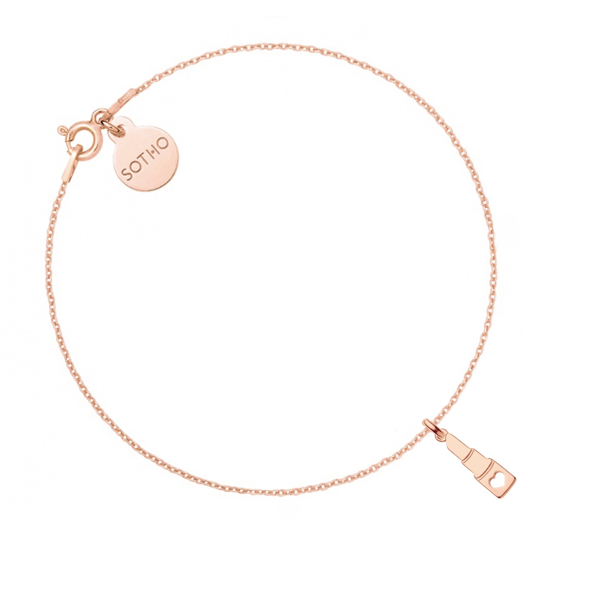 Złota bransoletka łańcuszkowa zdobiona szminką i zawieszką z logo marki. Całość wykonana ze srebra 925 powlekanego 24 karatowym różowym złotem.
